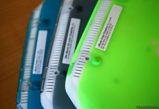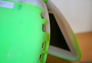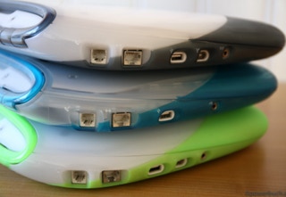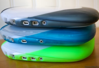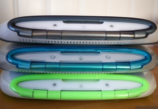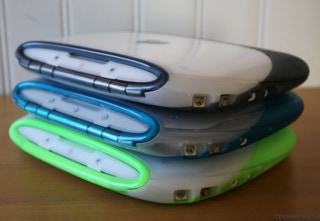 By the time 1999 rolled around, the four product matrix was almost complete. Apple had the power macintosh g3 to fill the pro desktop spot, the imac to fill the consumer desktop spot, and the powerbook g3 to fill the pro laptop, but had yet to release a consumer laptop. That changed in july when apple introduced the ibook. The ibook was essentially a portable imac, complete with a handle and transparent, fruit-colored case options.The ibook has a bold design with rounded edges and swooping curves. Looking from the top, the ibook case tapers out from the back to the front, giving it the shape of a clamshell. The case is made out of translucent “ice” plastic accented with swooshes of “tangerine” or “blueberry” rubberized plastic around the front, top and sides. The top of the case includes a rather large apple symbol – larger than any apple symbol i’ve seen on any of apple’s other laptops. In fact, the ibook itself is rather large, barely an inch narrower than a 15″ macbook pro and over an inch deeper. It’s also heavy – at 6.7 lbs it weighs almost a pound more than the top-of-the line powerbook g3 of the time. The translucent plastic makes it is easy to see that the case of the ibook has considerable padding around the edges of the screen and the keyboard area. The reason for all of the heft is that the ibook was designed to sustain constant use. It was marketed to the consumer crowd – parents, students, teachers, schools, kids, casual users – people who wouldn’t necessarily take gentle care of a computer, especially a laptop. To make the ibook durable, apple made the case extra large, omitted port door covers, recessed the ports deeply into the case, added rubber buffers around the hard drive, and removed the screen latch entirely –replacing it with a spring loaded mechanism instead. Apple marketed the ibook towards school computer labs and created a special charging station that could charge multiple ibook simultaneously using the two charging contacts on the bottom of the case.
